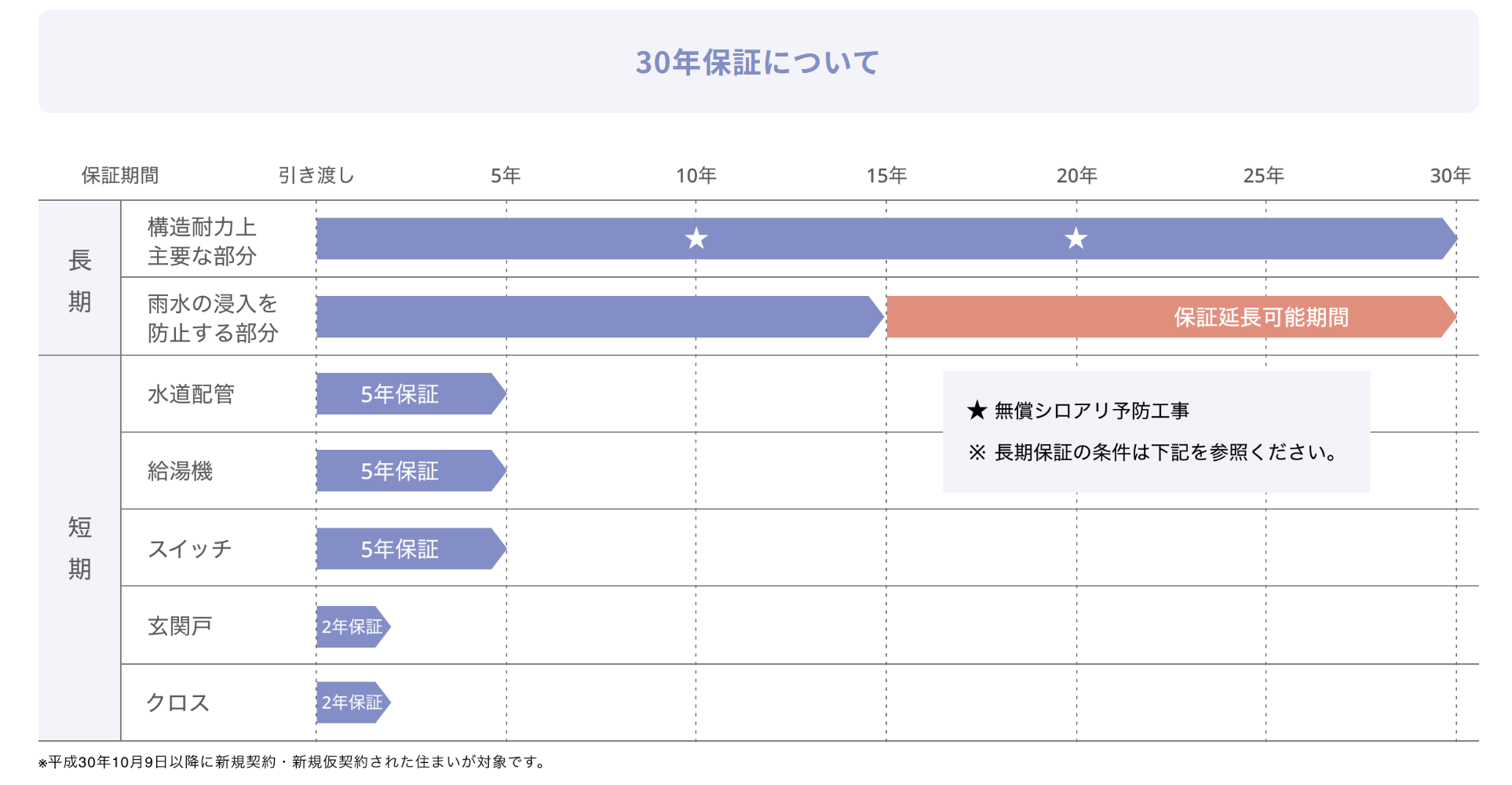 ちなみに2018年10月以前に契約と以後に契約で有償メンテナンスが必要になる頻度が違うみたいで、このブログの方は2018年以前に建てられているので、「30年長期保証は、10年目、15年目、20年目の定期点検(無償)と必要なメンテナンス工事(有料)が保証適用条件となります」とのこと