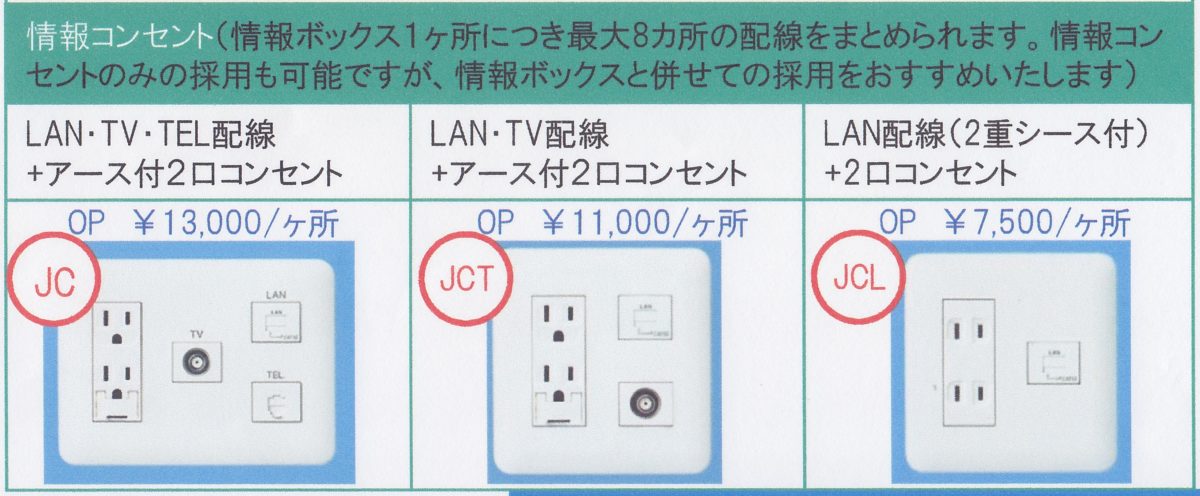そして、こういう情報コンセント(LANとアンテナと、必要なら電話のポートついたもの)を全部屋につけておいてもらえばOK
